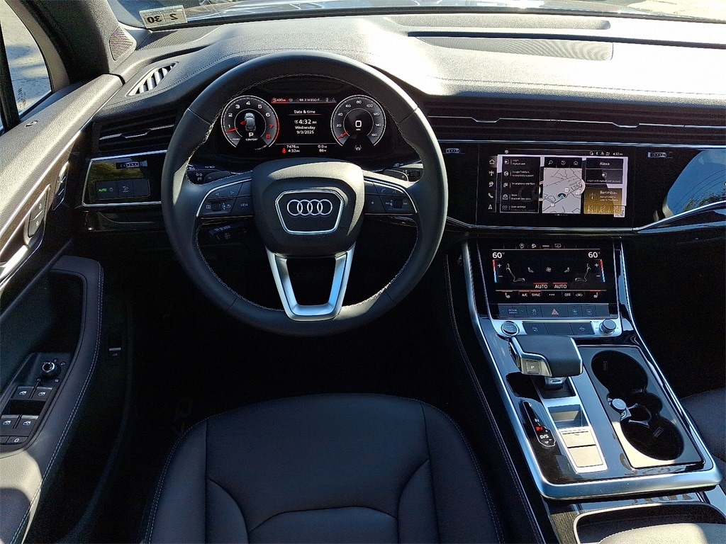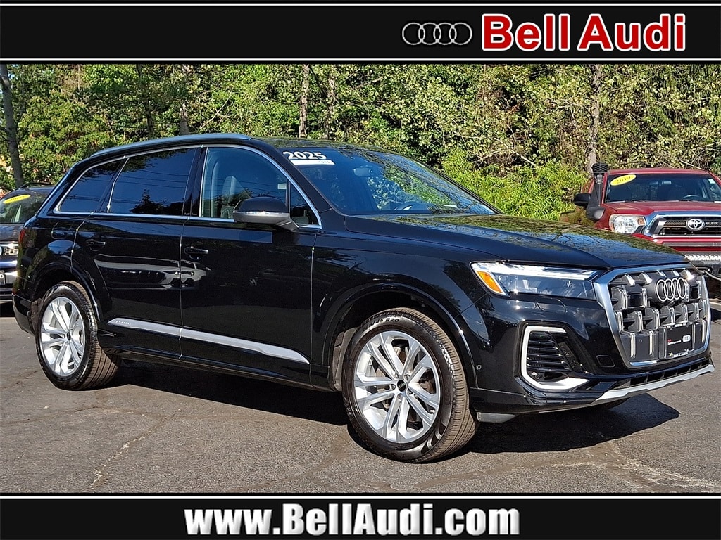 Certified. 2025 Audi Q7 Premium Plus quattro Mythos Black Metallic CARFAX One-Owner. Clean CARFAX. 3.0L TFSI 8-Speed Automatic with Tiptronic quattro Audi Certified!!, Bluetooth, Hands-free, Backup Camera, Quattro AWD, 10 Speakers, 3rd row seats: bench, 4-Wheel Disc Brakes, 7-Pin Adapter, ABS brakes, Air Conditioning, Alloy wheels, AM/FM radio: SiriusXM w/ 360L, Audi Beam Rings, Audi Guard All-Weather Mats, Auto High-beam Headlights, Auto-dimming door mirrors, Auto-dimming Rear-View mirror, Automatic temperature control, Bang & Olufsen Premium Sound System w/3D Sound, Brake assist, Bumpers: body-color, Compass, Convenience Package, Delay-off headlights, Driver door bin, Driver vanity mirror, Dual front impact airbags, Dual front side impact airbags, Electronic Stability Control, Emergency communication system: Audi connect CARE, Exterior Parking Camera Rear, Four wheel independent suspension, Front anti-roll bar, Front Bucket Seats, Front Center Armrest, Front dual zone A/C, Front fog lights, Front reading lights, Fully automatic headlights, Garage door transmitter: HomeLink, Genuine wood door panel insert, Heated door mirrors, Heated Front Bucket Seats, Heated front seats, Heated Steering Wheel, Illuminated Door Sills, Illuminated entry, Leather Seating Surfaces, Leather Shift Knob, Leather steering wheel, LED Interior Lighting Package Plus, Low tire pressure warning, Memory seat, Occupant sensing airbag, Outside temperature display, Overhead airbag, Overhead console, Panic alarm, Passenger door bin, Passenger vanity mirror, Power door mirrors, Power driver seat, Power Liftgate, Power moonroof: Panoramic, Power passenger seat, Power steering, Power windows, Premium Plus Package, Radio data system, Radio: Audi Sound System, Rain sensing wipers, Rear air conditioning, Rear anti-roll bar, Rear fog lights, Rear reading lights, Rear seat center armrest, Rear side impact airbag, Rear window defroster, Rear window wiper, Reclining 3rd row seat, Remote keyless entry, Security system, Speed control, Speed-sensing steering, Split folding rear seat, Spoiler, Steering wheel memory, Steering wheel mounted audio controls, Tachometer, Telescoping steering wheel, Tilt steering wheel, Top View Camera System, Traction control, Trailer Hitch, Trip computer, Turn signal indicator mirrors, Variably intermittent wipers, Wheels: 20" 5-Double-Spoke, Wireless Phone Charging Pad Delete.