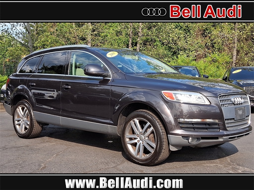 2008 Audi Q7 4.2 Premium Phantom Black Pearl Effect Clean CARFAX. 4.2L 8-Cylinder FSI 32V 350 hp Automatic with Tiptronic quattro 14 Speakers, 20" x 9" Twin-Spoke Alloy Wheels, 3rd row seats: bench, 4-Wheel Disc Brakes, 4.32 Axle Ratio, ABS brakes, Air Conditioning, Alloy wheels, AM/FM radio: SIRIUS, AM/FM w/6CD/DVD-Based Navigation/SIRIUS Satellite, Auto tilt-away steering wheel, Auto-dimming door mirrors, Auto-dimming Rear-View mirror, Automatic temperature control, Brake assist, Bumpers: body-color, CD player, Compass, Delay-off headlights, Driver door bin, Driver vanity mirror, Driver's Seat Mounted Armrest, Dual front impact airbags, Dual front side impact airbags, Electronic Stability Control, Exterior Parking Camera Rear, Four wheel independent suspension, Front anti-roll bar, Front Bucket Seats, Front dual zone A/C, Front fog lights, Front reading lights, Fully automatic headlights, Garage door transmitter: HomeLink, Genuine wood console insert, Genuine wood door panel insert, Heated door mirrors, Heated Front Bucket Seats, Heated front seats, High intensity discharge headlights: Xenon plus, Illuminated entry, Leather Seating Surfaces, Leather steering wheel, Low tire pressure warning, Memory seat, Navigation System, Occupant sensing airbag, Outside temperature display, Overhead airbag, Overhead console, Panic alarm, Passenger door bin, Passenger seat mounted armrest, Passenger vanity mirror, Power door mirrors, Power driver seat, Power Liftgate, Power passenger seat, Power steering, Power windows, Radio data system, Rain sensing wipers, Rear air conditioning, Rear anti-roll bar, Rear dual zone A/C, Rear fog lights, Rear reading lights, Rear seat center armrest, Rear Window Blind, Rear window defroster, Rear window wiper, Remote keyless entry, Roof rack: rails only, Security system, SIRIUS Satellite Radio, Speed control, Speed-sensing steering, Split folding rear seat, Spoiler, Steering wheel memory, Steering wheel mounted audio controls, Tachometer, Telescoping steering wheel, Tilt steering wheel, Traction control, Trip computer, Turn signal indicator mirrors, Variably intermittent wipers.