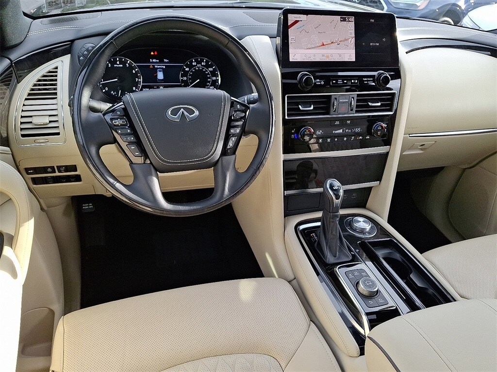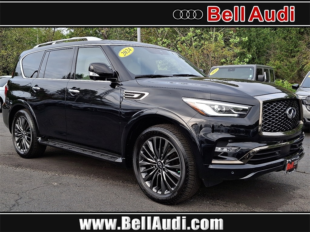 2024 INFINITI QX80 Sensory Mineral Black CARFAX One-Owner. Clean CARFAX. 5.6L V8 7-Speed Automatic 4WD All Wheel Drive, 17 Speakers, 2.937 Axle Ratio, 3rd row seats: bench, 4-Wheel Disc Brakes, ABS brakes, Air Conditioning, Alloy wheels, AM/FM radio: SiriusXM, Anti-whiplash front head restraints, Apple CarPlay/Android Auto, Auto High-beam Headlights, Auto tilt-away steering wheel, Auto-dimming door mirrors, Auto-dimming Rear-View mirror, Auto-leveling suspension, Automatic temperature control, Black Painted Mirror Caps, Brake assist, Bumpers: body-color, Cargo Package, Climate Controlled Front Bucket Seats, Compass, Console Net, Dark Chrome Front Fascia Trim, Dark Chrome Grille Surround, Delay-off headlights, Driver door bin, Driver vanity mirror, Dual front impact airbags, Dual front side impact airbags, Electronic Stability Control, Emergency communication system: INFINITI InTouch, First-Aid Kit, Four wheel independent suspension, Front anti-roll bar, Front Bucket Seats, Front Center Armrest, Front dual zone A/C, Front fog lights, Front reading lights, Fully automatic headlights, Garage door transmitter: HomeLink, Heated door mirrors, Heated front seats, Heated rear seats, Heated steering wheel, Illuminated entry, Leather Shift Knob, Leather steering wheel, Literature Kit, Low tire pressure warning, Memory seat, Moisture-Resistant Rear Cargo Carpet, Navigation system: INFINITI InTouch Navigation, Nylon-Cord Cargo Net, Occupant sensing airbag, Outside temperature display, Overhead airbag, Overhead console, Panic alarm, Passenger door bin, Passenger vanity mirror, Perforated Semi-Aniline Leather-Appointed Seats, Power door mirrors, Power driver seat, Power Liftgate, Power moonroof, Power passenger seat, Power steering, Power windows, Radio data system, Radio: Bose Performance Audio System w/17 Speakers, Rain sensing wipers, Rear air conditioning, Rear anti-roll bar, Rear reading lights, Rear seat center armrest, Rear window defroster, Rear window wiper, Reclining 3rd row seat, Remote keyless entry, Roof Rail Cross Bars, Security system, Sensory Dark Chrome Appearance Package, Speed control, Speed-sensing steering, Split folding rear seat, Spoiler, Steering wheel memory, Steering wheel mounted audio controls, Tachometer, Telescoping steering wheel, Tilt steering wheel, Traction control, Trip computer, Turn signal indicator mirrors, Variably intermittent wipers, Ventilated front seats, Voltmeter, Wheels: 22" Dark Chrome Cast Aluminum-Alloy.